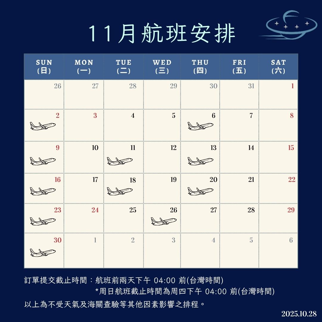 圖片為2025年11月的航班安排,請留意訂單截止時間為航班前兩天的下午 04:00(台灣時間)周日的航班,訂單截止時間為周四下午 04:00(台灣時間)例如:11/2(日)航班,訂單截止時間為10/30(四)下午 04:00;11/6(四)航班,訂單截止時間為11/4(二)下午 04:00